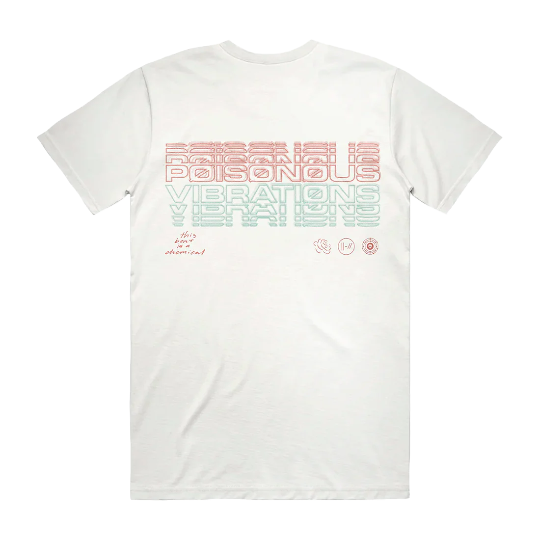 The Twenty One Pilots 'Poisonous Vibes Hollow T-Shirt (White)' here features 'TWENTY ONE PILOTS' on the front of the t-shirt and 'POISONOUS VIBRATIONS' on the back of the design. This design is on a white unisex Colortone 100% cotton t-shirt.